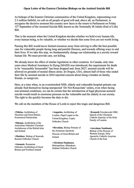 „Като епископи на източнохристиянските общности във Великобритания, представляващи над 2,5 милиона вярващи, призоваваме всички хора с добра воля и най-вече Парламента да осъзнаят решителния момент, пред който страната сега е изправена с връщането за разглеждане в Парламента на 12 септември на Закона за асистираното самоубийство, известен като Закон за терминално болни възрастни (Закон за края на живота)“, пишат епископите.